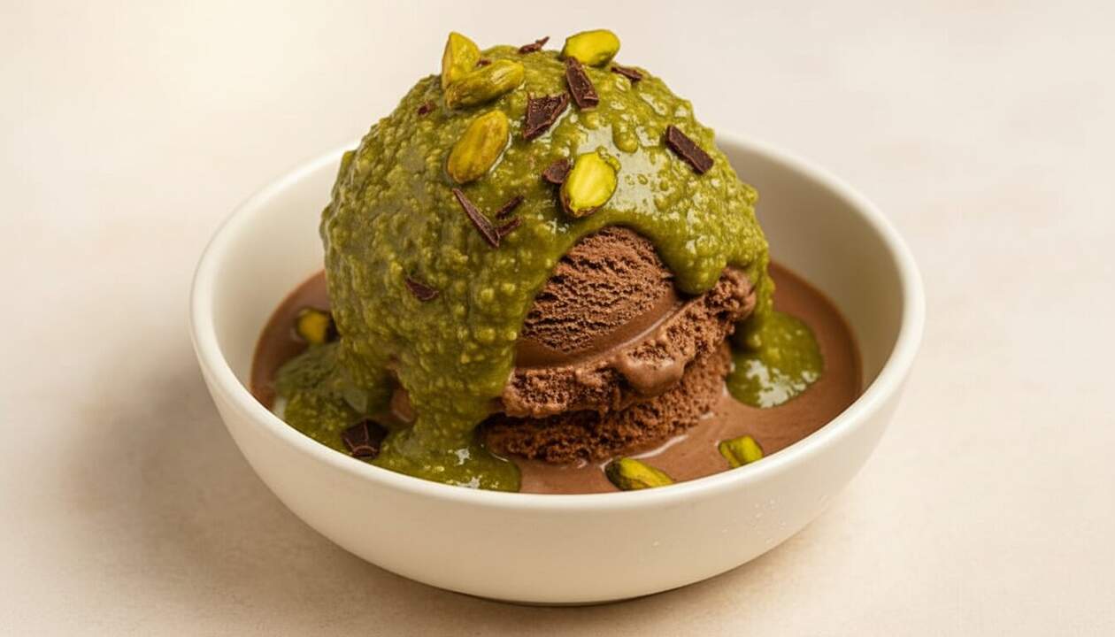 ¿La gracia? El contraste. Por un lado, helado de chocolate bien frío. Por el otro, fideos de masa kataifi (también escritos kadaif) dorados en manteca y abrazados por una pasta de pistacho que lo vuelve… peligroso. Sí. De esos que “solo pruebo una cucharada” y terminás raspando el bowl.